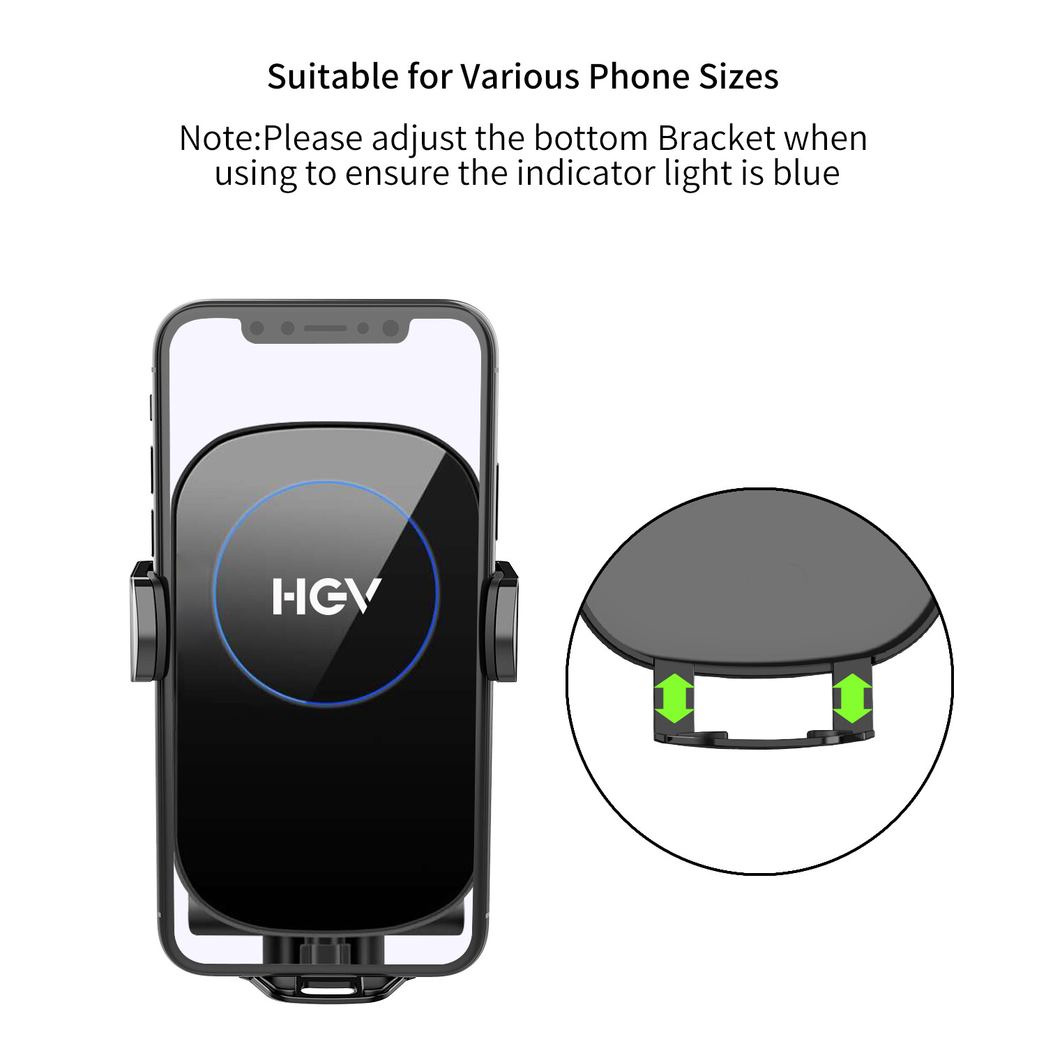 Product name: HGV wireless car charger Model: YZK-001-2 Interface type: USB-C Input: 5V / 2A 9V / 2A 12V / 2A Output: 5V / 1A, 9V / 1.2A, 12V / 1.5A Output power: 5W, 7.5W, 10W, 15W Material: PC + glass Charging power supply: 10K-205K HZ Charging efficiency: 80%-85% Charging distance: <10mm