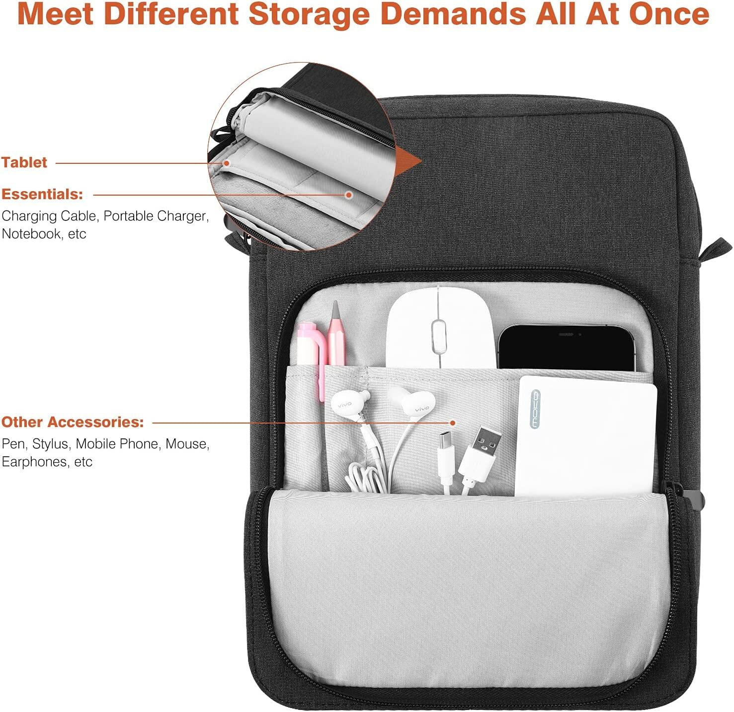 In addition to the tablet, the main compartment can also store cables, chargers, power banks, etc. The outer zipper pocket can keep other accessories well-organized, like pens, mobile phones, mice, earphones.