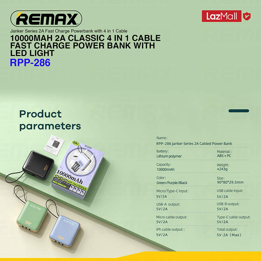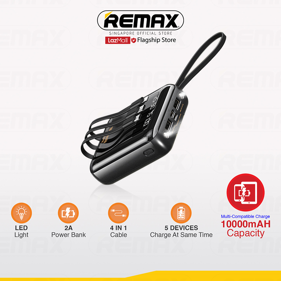[Remax Energy] RPP-286 10000mAH 2A Classic Mini Lightweight Fast Charge Power Bank With LED Flash Light + 4 In 1 Cable