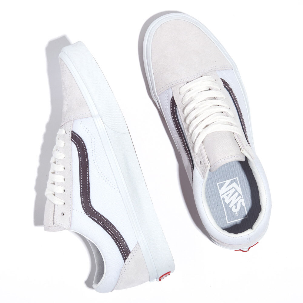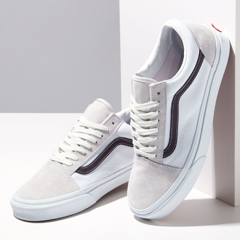 The Clouds Old Skool, the Vans classic skate shoe, is a low top lace-up featuring sturdy suede uppers, re-enforced toe caps to withstand repeated wear, padded collars for support and flexibility, and signature rubber waffle outsoles.