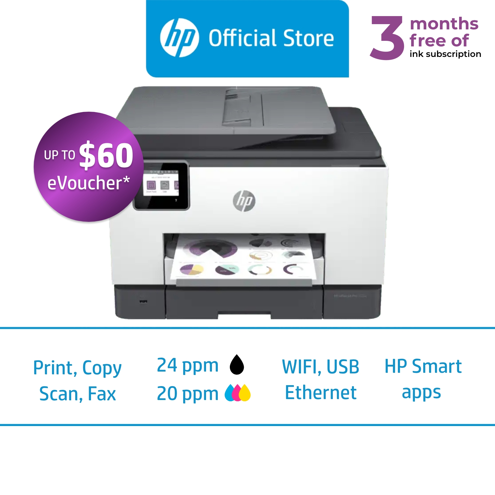 HP OfficeJet Pro 9020 All-in-One Wireless Color Inkjet Printer / Print, Copy, Scan, Mobile Fax / ADF / Front USB Port / Duplex / Two-Sided Printing / Two-Sided Scanning / Touchscreen / One Year Warran