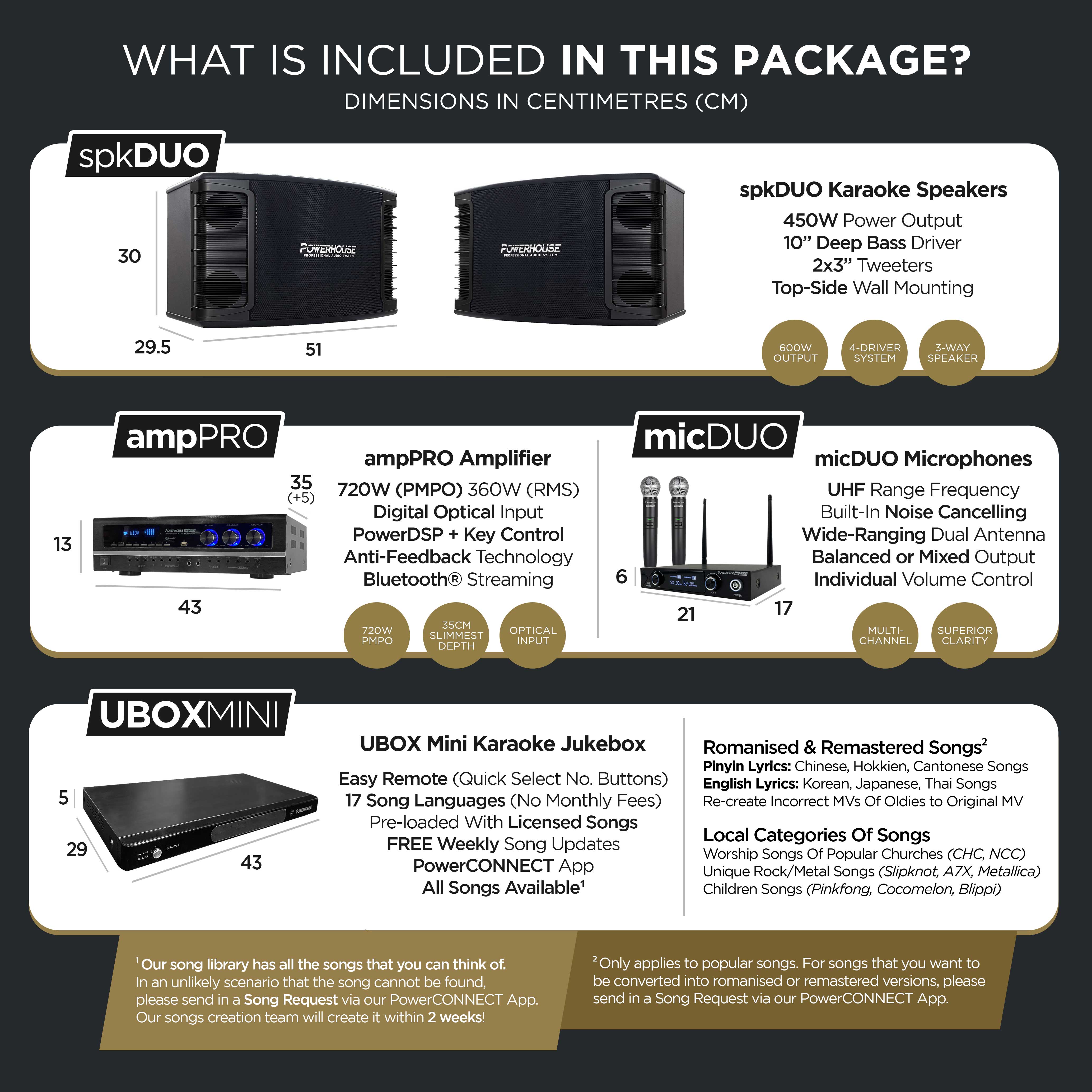 Karaoke system for home is now made affordable with our new "Powerhouse spkDUO Affordable Home Karaoke System"! Using conventional karaoke speakers, we have refined sound quality produced by these spkDUO 10" Karaoke Speakers for that perfect home karaoke system experience! This karaoke system package comes complete with our flagship "Powerhouse Touchscreen Karaoke System With Songs" or "Powerhouse Jukebox (Non-Touchscreen) Karaoke System With Songs" that includes all your karaoke songs preloaded with free automated weekly songs updates! Enjoy unlimited access to our entire Songs Library of 17 Karaoke Songs Languages. It's time to get a KTV system for your home now!