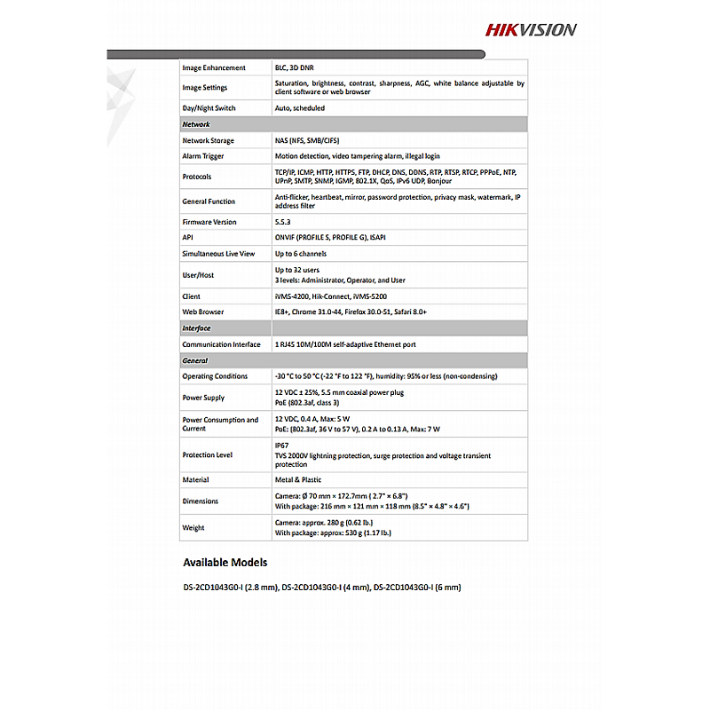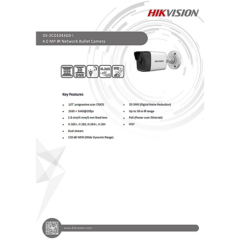 Hikvision 4MP IR Network Bullet PoE IP Camera (2.8mm) DS-2CD1043G0-I